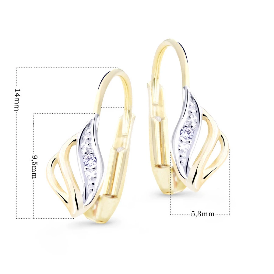 Zlaté náušnice so zirkónmi zo žltého zlata rýdzosti 585/1000. Elegantné zlaté visiace náušnice ozdobené zirkónmi. Náušnicové zapínanie je na klapku. Rozmery náušníc nájdete zobrazené na podpornej fotografii.