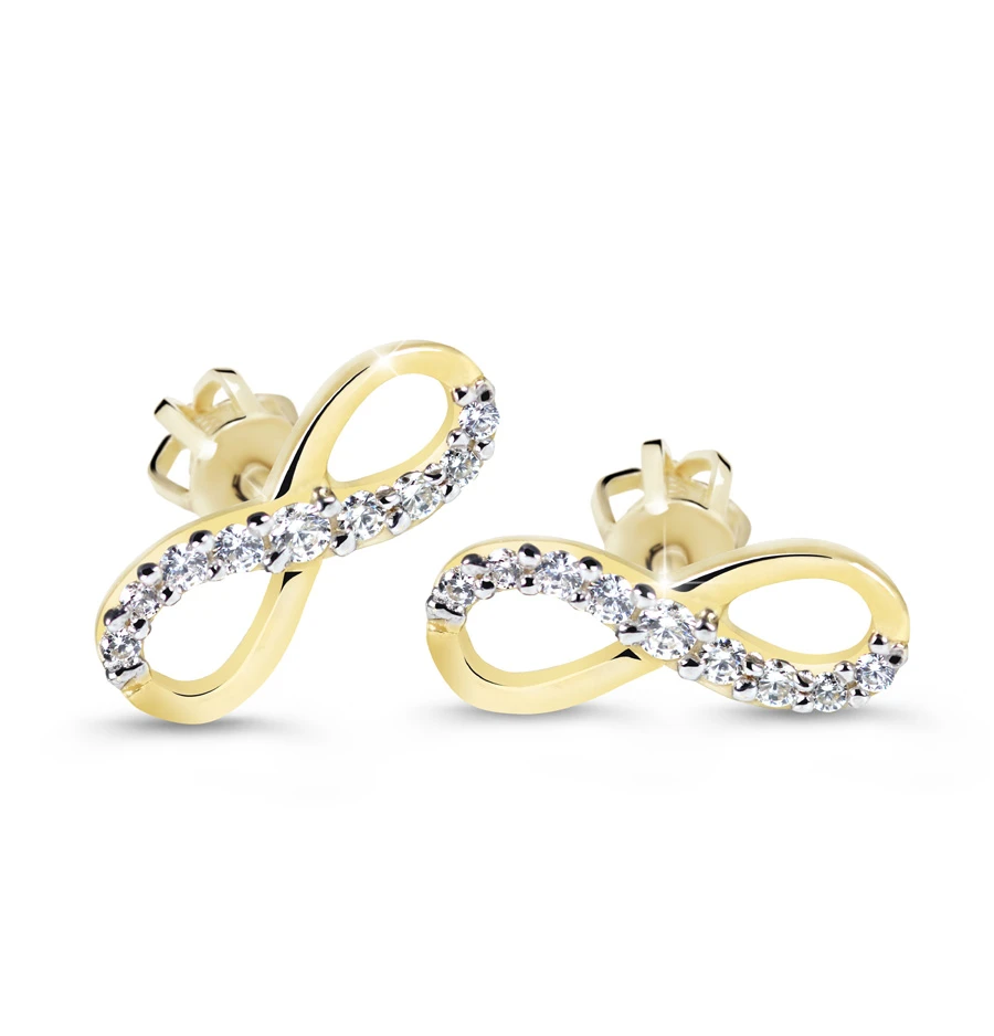 Náušnice zo žltého zlata rýdzosti 585/1000. Zlaté náušnice so symbolom nekonečna od českého návrhára a výrobcu krásnych zlatých šperkov Cutie Jewellery. Zlaté náušnice ponúkané a predávané v našom eshope sú riadne označené a opuncované podľa puncového zákona.