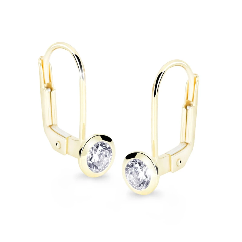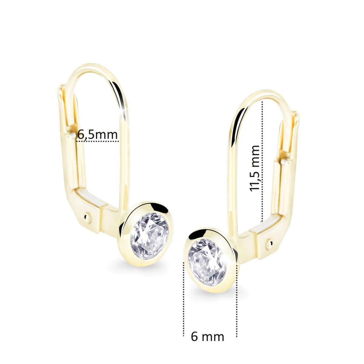 Náušnice zo žltého zlata rýdzosti 585/000. Zlaté náušnice so zirkónmi so zapínaním na klapku. Priemer ozdoby so zirkónom 6mm. Rozmery náušnice nájdete zobrazené na podporné fotografiu.