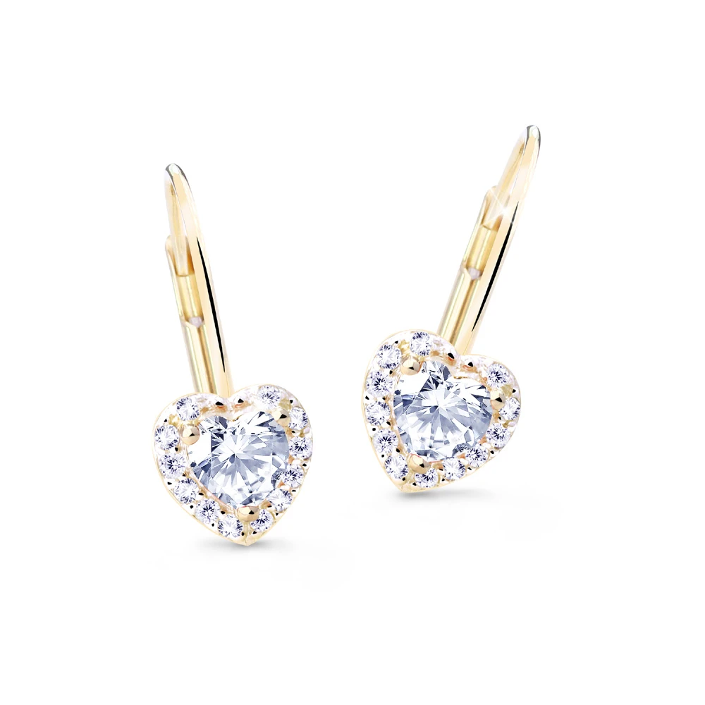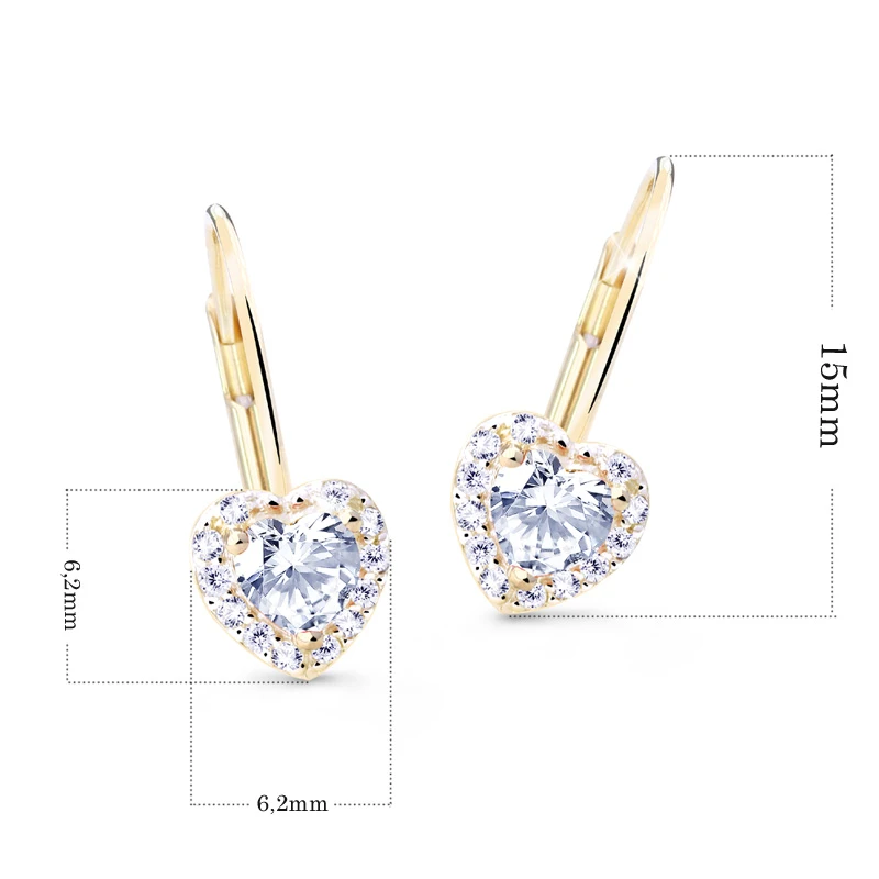 Visiace náušnice srdiečka zo žltého zlata rýdzosti 585/1000. Náušnice sú ozdobené zirkónmi a sú určené pre dievčatá a ženy. Náušnicové zapínanie je na klapku. Rozmery náušníc 15x6,2x6,2mm, nájdete zobrazené na podpornej fotografii. Krásne zlaté náušnice so srdiečkami pre vaše drahé.