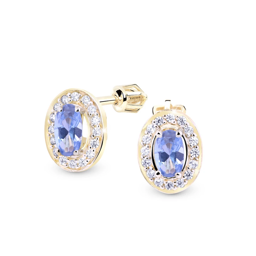 Zlaté náušnice so zirkónmi oválneho tvaru. Náušnice sú vyrobené zo žltého zlata 585/1000 a osadené sú prvotriednymi zirkónmi. Náušnicové zapínanie je na skrutku. Výška náušníc 9mm, šírka 7mm.