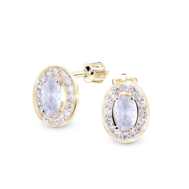 Zlaté náušnice so zirkónmi oválneho tvaru. Náušnice sú vyrobené zo žltého zlata 585/1000 a osadené sú prvotriednymi zirkónmi. Náušnicové zapínanie je na skrutku. Výška náušníc 9mm, šírka 7mm.