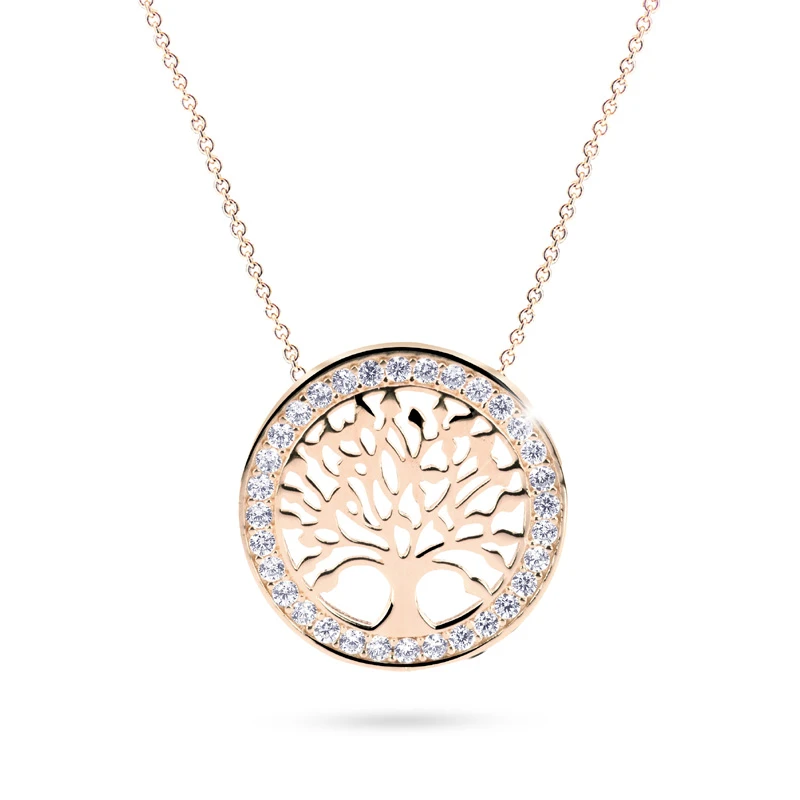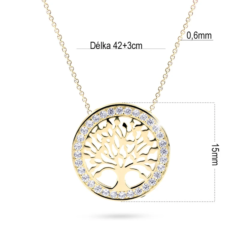 Náhrdelník z ružového zlata rýdzosti 585/1000. Ozdoba so stromom života má priemer 15mm. Strom života je dokola osadený prvotriednymi zirkónmi. Dĺžku náhrdelníka je možné pomocou nastavovacej retiazky meniť v rozmedzí 42-45cm.