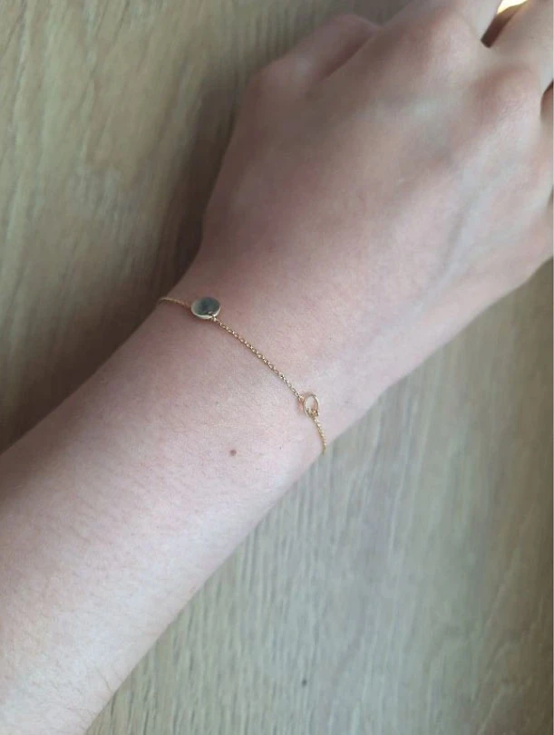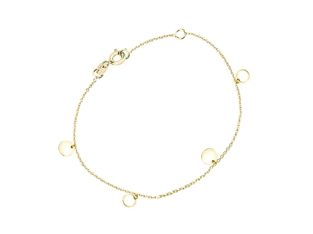 Jemný dámsky náramok zo žltého zlata rýdzosti 585/1000. Náramok je ozdobený príveskami v tvare peniažkov a krúžkov. Peniazky majú priemer 6mm, krúžky majú priemer 5mm. Retiazka je široký 1,0mm. Náramok je možné vďaka vloženému očku zapnúť v dĺžke 16cm, alebo 18cm. Náramok sa zapína pomocou perového krúžku.
