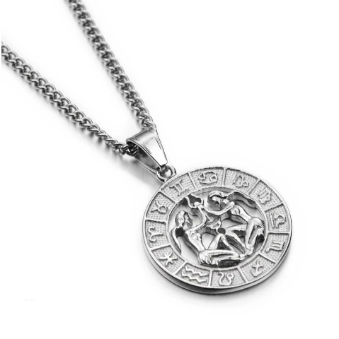 Prívesok so znamením Blížence (22.5 - 21.6). Prívesok je vyrobený z chirurgickej ocele. Znamenie blížence je "lemované" symbolmi ostatných znamení zverokruhu. Súčasťou znamenia je retiazka z chirurgickej ocele vzor pancr so zapínaním na karabínu, dlhý 60cm. Prívesok má priemer 30mm. Na prianie je možné retiazku zadarmo skrátiť.