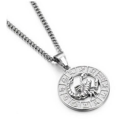 Prívesok so znamením škorpióna (24.10-22.11). Prívesok je vyrobený z chirurgickej ocele. Znamenie škorpióna je "lemované" symbolmi ostatných znamení zverokruhu. Súčasťou znamenia je retiazka z chirurgickej ocele vzor pancr so zapínaním na karabínu, dlhý 60cm. Prívesok má priemer 30mm. Na prianie je možné retiazku zadarmo skrátiť.