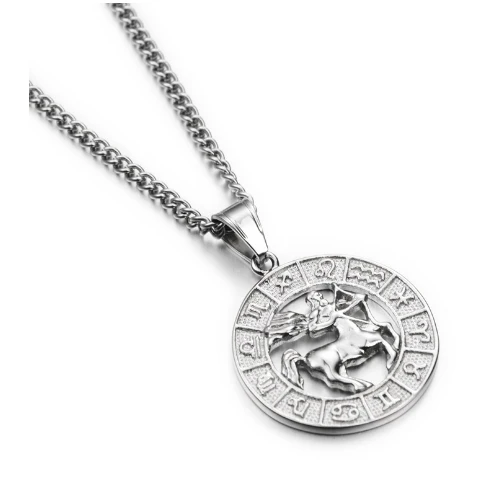 Prívesok so znamením strelca (23.11 - 21.12). Prívesok je vyrobený z chirurgickej ocele. Znamenie strelca je "lemované" symbolmi ostatných znamení zverokruhu. Súčasťou znamenia je retiazka z chirurgickej ocele vzor pancr so zapínaním na karabínu, dlhý 60cm. Prívesok má priemer 30mm. Na prianie je možné retiazku zadarmo skrátiť.