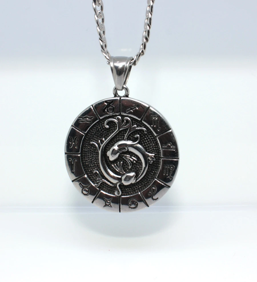 Prívesok so znamením ryb (21.2- 20.3) Prívesok je vyrobený z chirurgickej ocele. Znamenie ryb je "lemované" symbolmi ostatných znamení zverokruhu. Súčasťou znamenia je retiazka z chirurgickej ocele vzor pancr so zapínaním na karabínu, dlhý 60cm. Prívesok má priemer 34mm. Na prianie je možné retiazku zadarmo skrátiť.